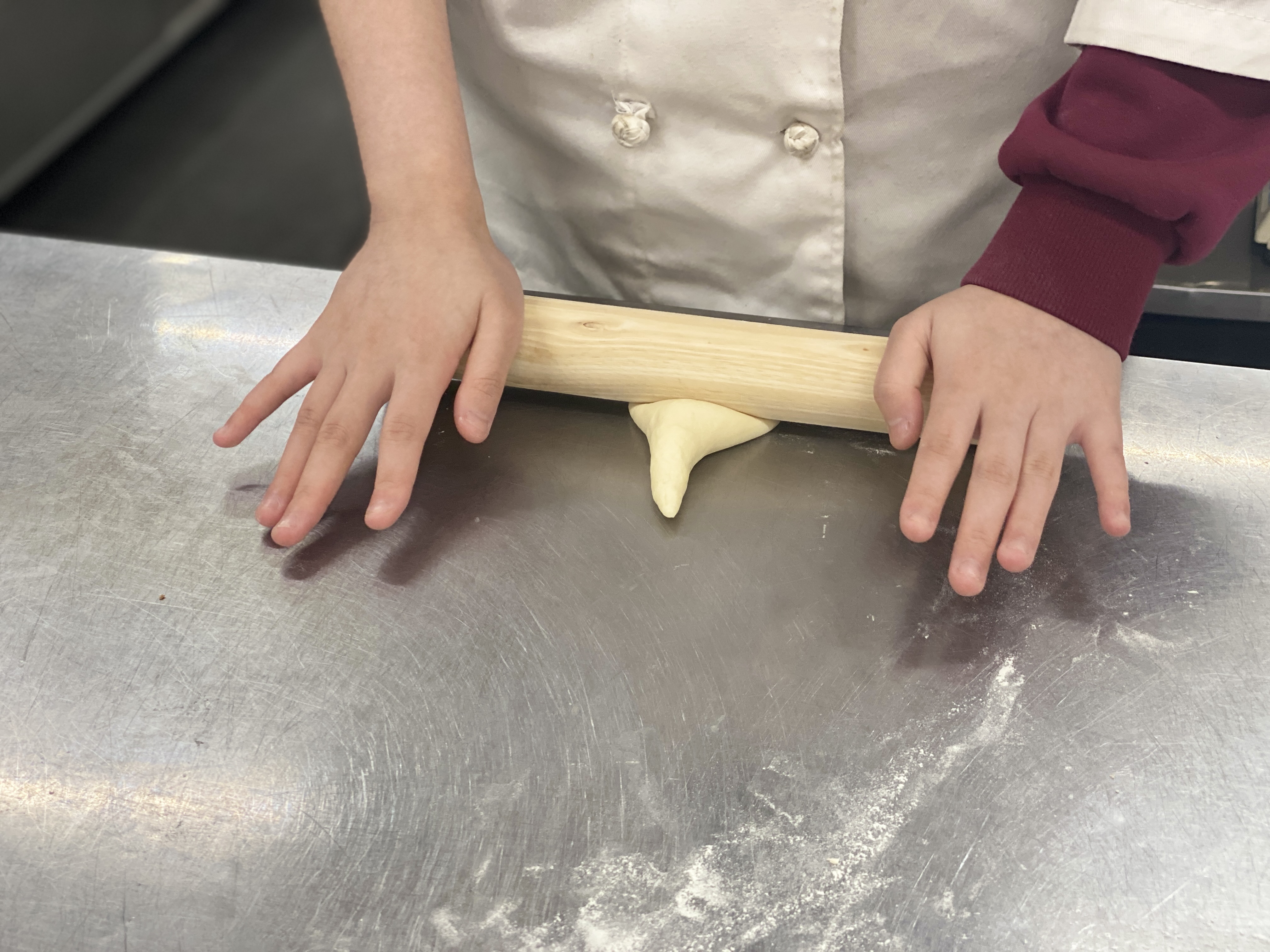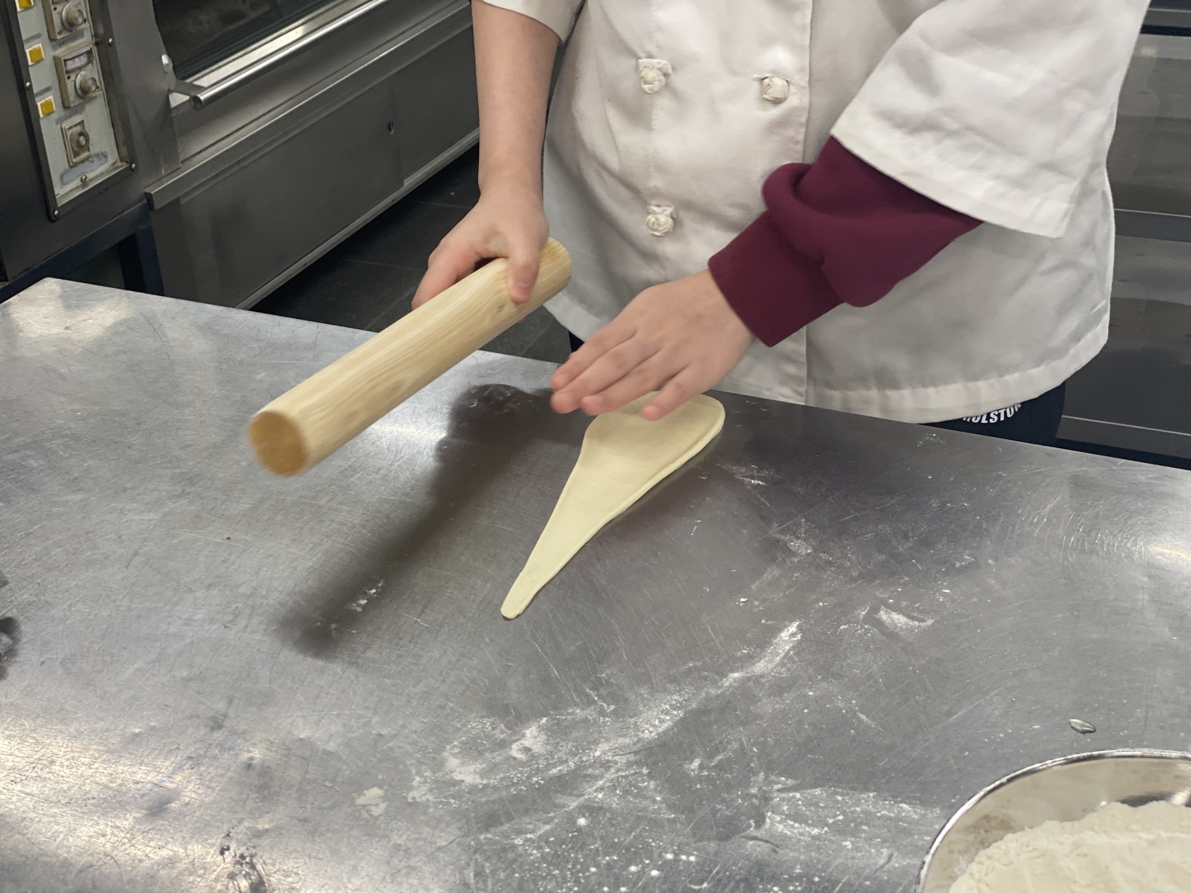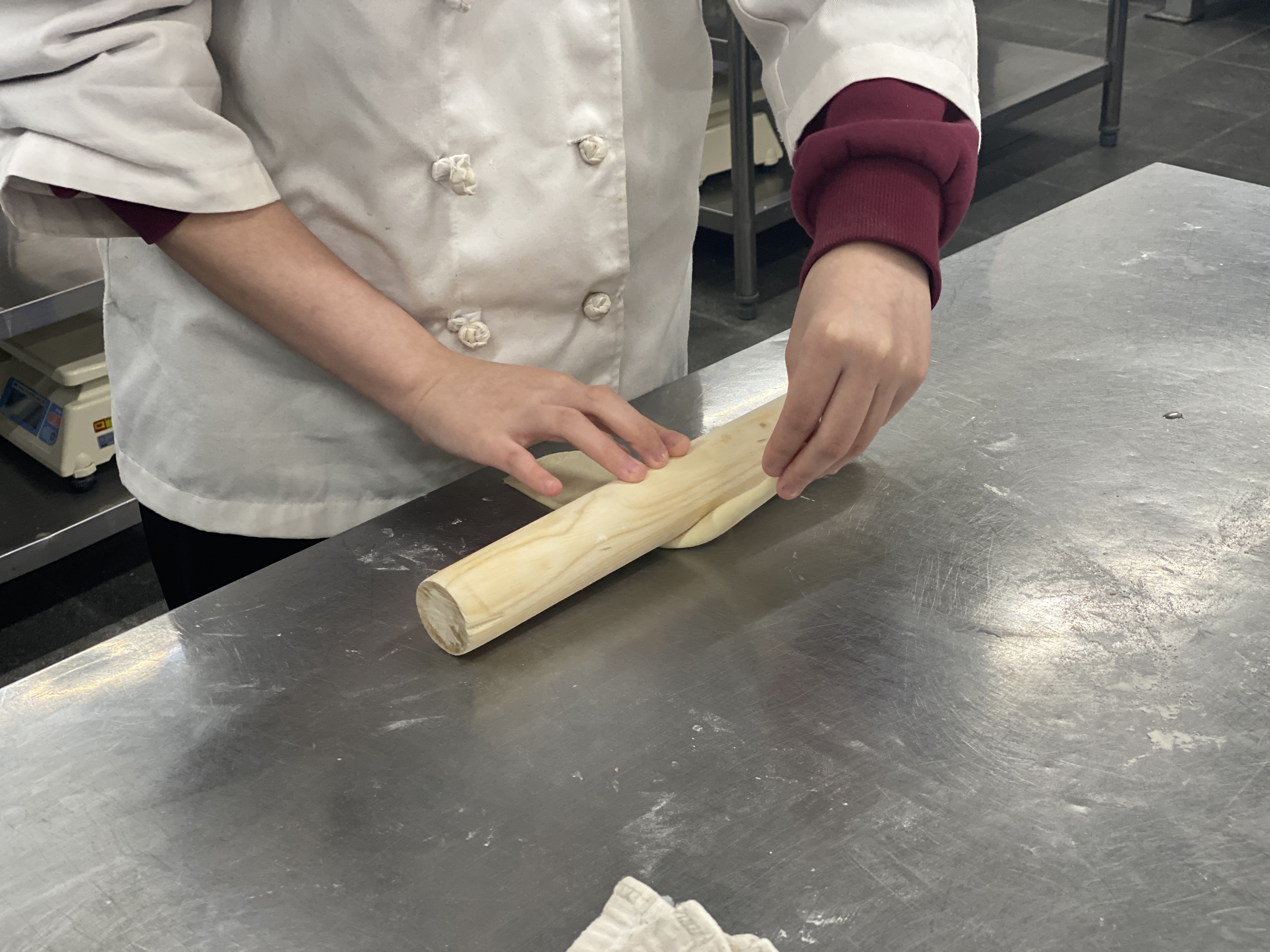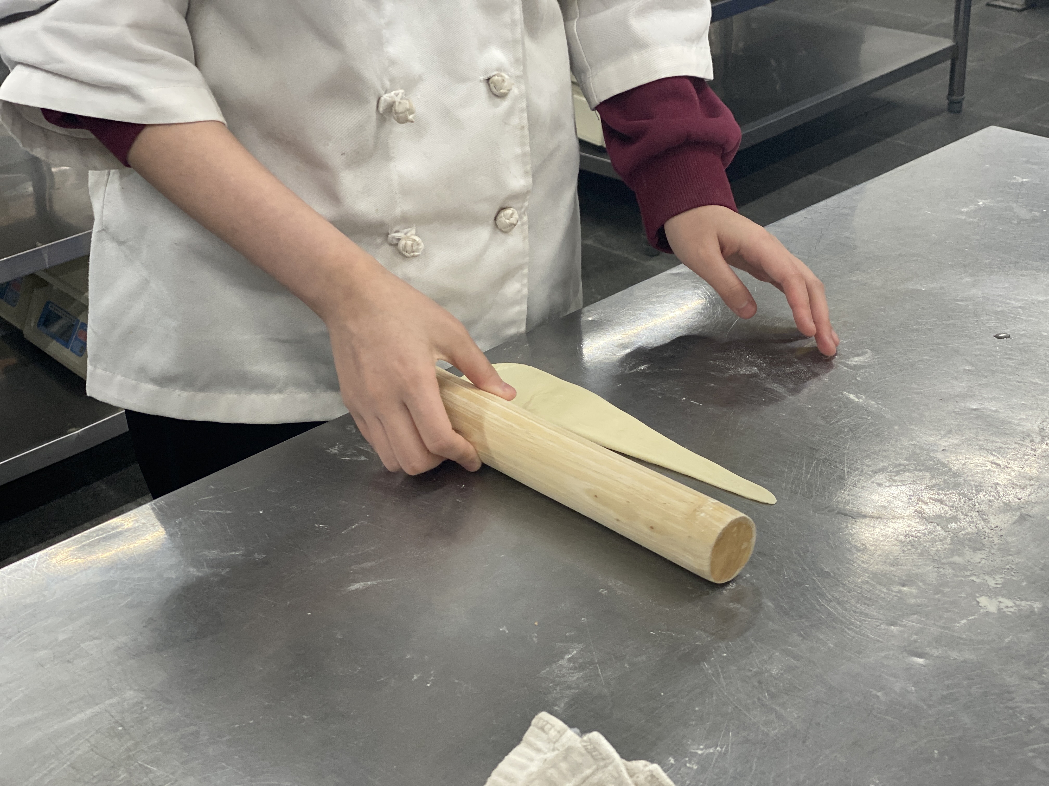 한손에는 밀대를 다른 한손은 반죽의 끝을 잡아 길게 늘려줍니다.