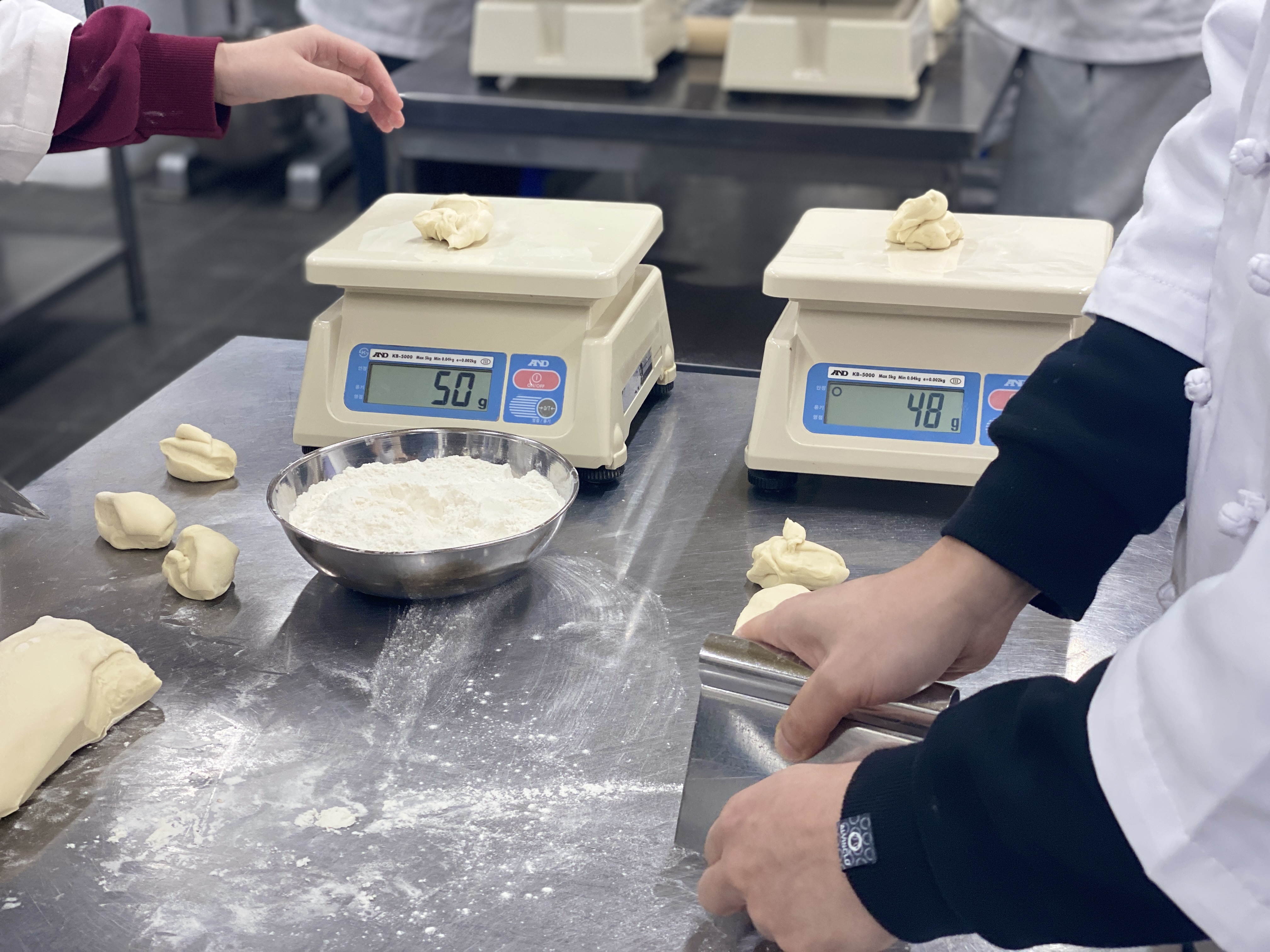 철 스크래퍼를 이용하여 정확하게 반죽 분할을 해주세요~